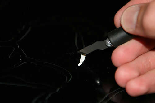 Ahora necesitas eliminar todas las piezas donde quieras pantalla de sol para ser rociada (piel blanca). Las malas hierbas con la misma hoja de x-acto #16 que corté con. Le arranco el filo de la pieza que estoy tratando de salir para levantar para arriba. Yo entonces tire el resto de la pieza a mano. Usted necesita tener cuidado de no levantar alrededor de pedazos porque generalmente no sólo vienen aparte sin una lucha.