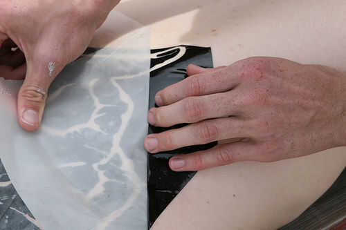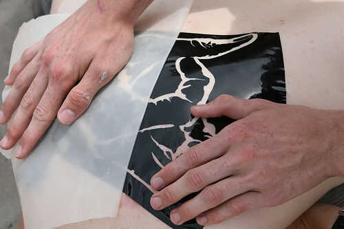 Retire la cinta de aplicación. Tenga cuidado de no levantar ninguno de los vinilos o rasgarla al retirar la cinta de aplicación. Uso duro tachuela que dificulta un poco el proceso. El vinilo se pega mejor si la piel está en está recién lavada y seca sin aceites ni sudor.