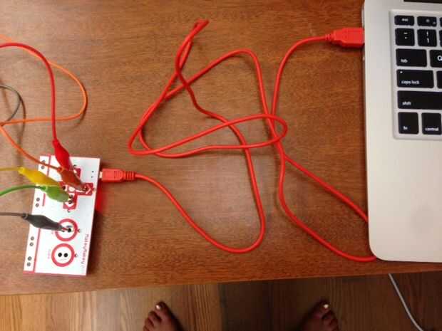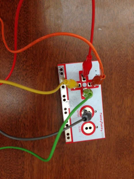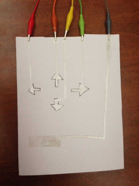 Para montar el circuito, usted necesita el libro que acaba de crear una herramienta Makey Makey y un ordenador. Primero conecte los cables de colores en el papel por lo que está tocando la tinta conductora...