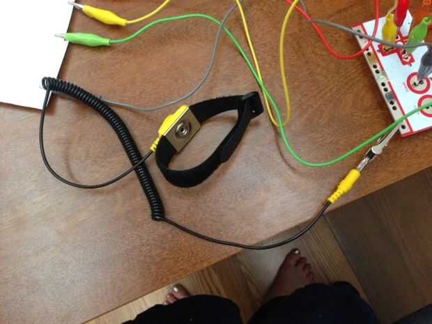 Luego conecte un cable a uno de los agujeros de la tierra en el Makey Makey. (Si desea, puede utilizar correa antiestática de muñeca, por lo que te sostiene, en lugar de usted manteniendo.)