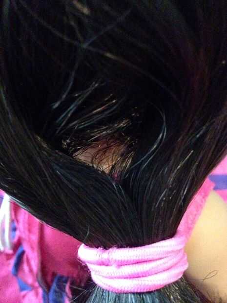 Sobre el titular de la cola de caballo, hacer un agujero en el pelo tirando el pelo por encima de la banda o empujar su dedo a través de él, como se muestra.