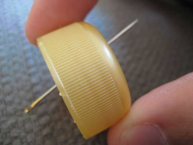 Dependiendo de lo que vamos a usar el aspersor para usted tendrá que decidir agujeros cuántos y cuánto desea. La tapa del puño que hice tenía no tantos (15) pero la agujeros grandes (uñas pequeñas) y el flujo de agua muy buena. Esta vez quiero una aspersión más fina para plantas delicadas. Por lo tanto estoy usando una aguja de coser. Tendrás que decidir lo que usted necesita.