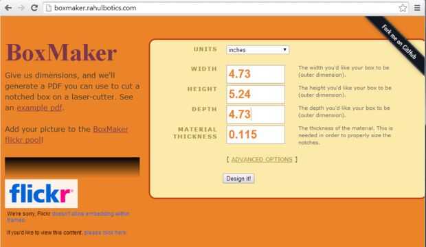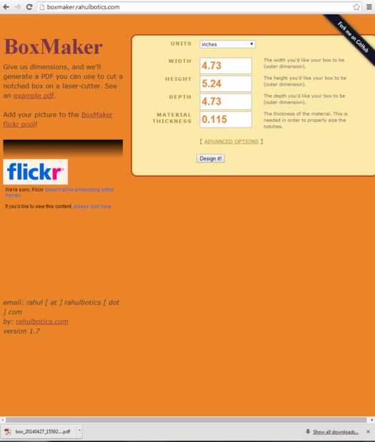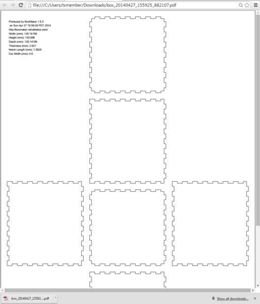 El primer paso es ir al sitio web http://boxmaker.rahulbotics.com/. Aquí entras las dimensiones de la caja que le gustaría. La caja del tejido fue 4.5 "X 4,5" X 5.125 ". Para la anchura y la dimensión de profundidad que necesitaba para añadir 2 veces el espesor del material desde el sitio consultar dimensiones exteriores. Así que ya que mi material es.115 gruesa que entré 4,73" para la anchura y la profundidad y la altura tomó la altura de la caja y agregó sólo una capa de espesor del material desde la parte inferior no se utiliza. Esto fue 5,24".
