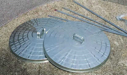 Debido al presupuesto restrictivo, decidí construir algo yo mismo y aunque el proceso de diseño, me llevó varios meses, el producto final parece mucho a mi diseño original. Para empezar, tuve que hacerlo con tuercas y tornillos como no tengo un soldador. Mi presupuesto también me obligaron a crear con materiales disponibles en la listos (nada especial orden.) Cuando la idea me golpeó con listo hecho tapas basurero galvanizado, lo de diseñó sí mismo.