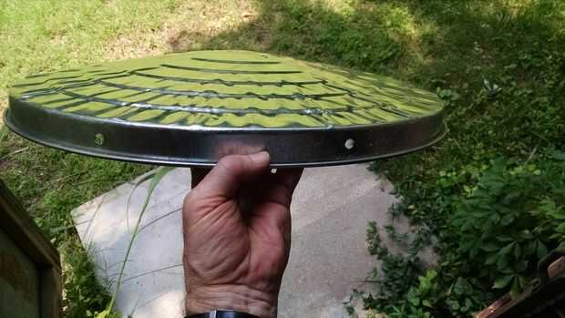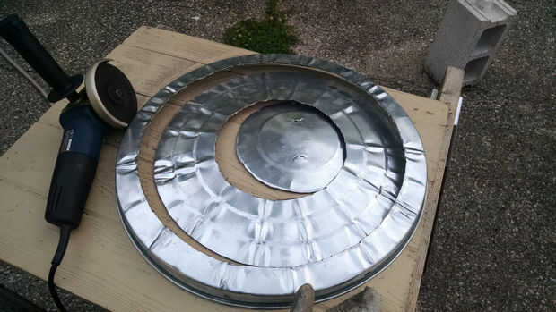 La tapa 2 º se corta usando una amoladora. Hice dos cortes creación de 3 piezas. No se utilizará el pedazo de centro y el agujero resultante es 9", para que coincida con el tamaño de la chimenea del centro de mi chimenea de pared triple. 2 º se efectúa el corte 1-1/2 pulgadas desde el borde exterior, dejando un 18" corte. Esto crea la base de la tapa, así como un anillo interno. El anillo central circular se utilizará más adelante.
