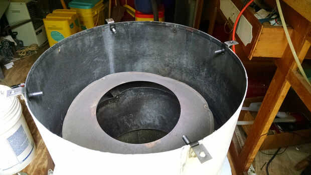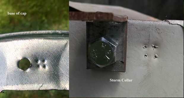 El collar de la tormenta se prepara por primera limpieza de la pintura vieja. 4 agujeros se cortan en él que la tapa de la chimenea a ser atado y quitado fácilmente para la limpieza. Ubicación de los orificios del borde se determina por las tuercas de clip de primavera. La primavera 4 tuercas están espaciadas uniformemente alrededor del exterior del collar de la tormenta.