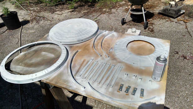 Las partes están establecidas y cebadas. Nuevamente es importante notar que aunque las piezas son hechas de acero galvanizado, los cortes no son galvanizados y podrían oxidarse; así que una buena capa o dos de imprimación y la pintura es importante.