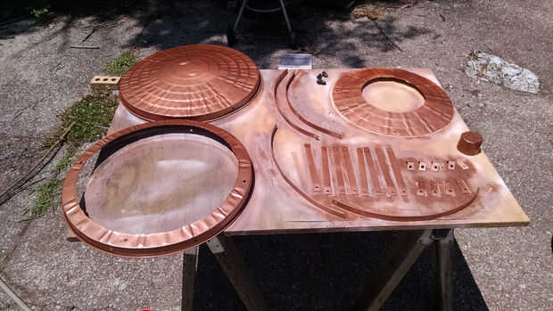 Una vez que ha secado la imprimación, las piezas se pintan con el color de acabado (en este caso, un final llamado 'martillado de cobre.') Mientras que las piezas se secan, el collar de tormenta está pintado para que coincida con. Luego se pintan las piezas imprimadas con el color cobre.