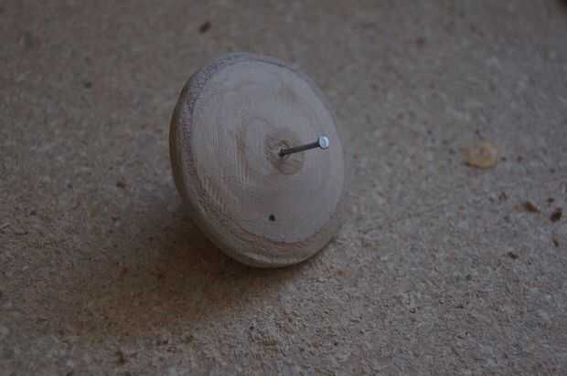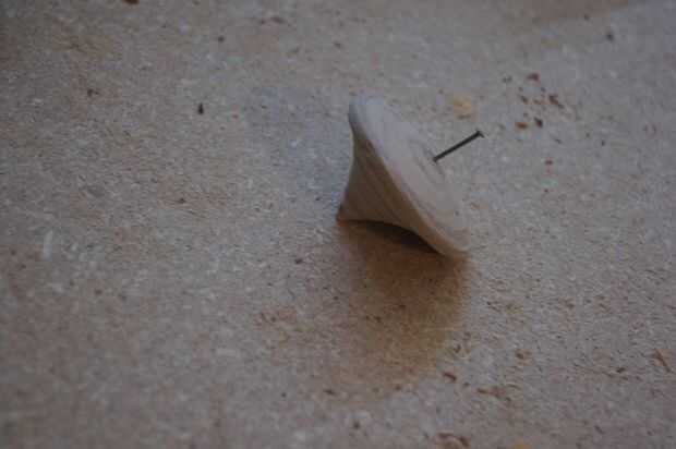 Una vez que la CNC se realiza ("buena CNC. bueno CNC,"), tomar las piezas y pegar juntos. Asegúrese de que la mantenga alineadas las 2 partes! Una manera fácil de asegurarse de que usted no desordenar es colocar un pequeño clavo en el centro de la parte superior y (después de que el pegamento fijar durante un minuto) gira suavemente la parte superior. Hacerlo con confianza, porque este tipo de proyectos puede oler el miedo. Si las partes están alineadas, la parte superior debe equilibrar relativamente (esto puede ser una palabra generosa) bien cuando se hace girar. Lijar la punta del equilibrio en un punto agudo mejorará el equilibrio, porque demostrará a la parte superior que eres su amo.