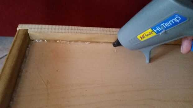 Utilicé una pistola de pegamento pero debido al tamaño de la longitud de la moldura, era difícil dejar suficiente pegamento antes el pegamento endurece. Si tuviera que hacerlo otra vez, probablemente usaría una capa generosa de pegamento para madera. Y ha grabado alrededor de los lados con cinta azul para sellar, si bien es aún seca. Era escaparse cuando estaba húmedo, y una vez que se escapa es muy complicado y desordenado sellar la fuga. Una onza de prevención vale una libra de curación.