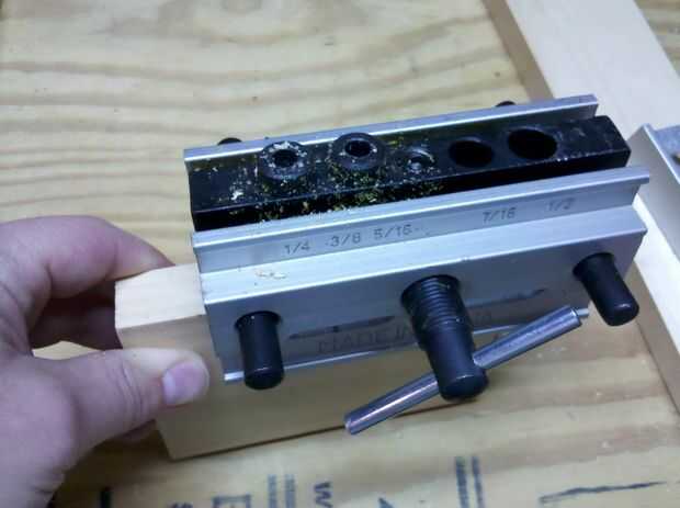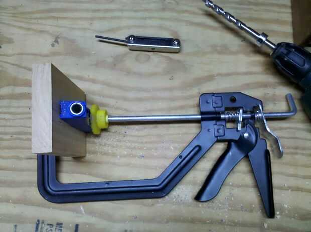 Las siguientes imágenes muestran cómo utilicé la plantilla de agujero de bolsillo para fijar el riel (pieza horizontal) al montante (pieza vertical). Sólo tienes que seguir las instrucciones incluidas con la plantilla. El posicionamiento de la plantilla y la longitud requerida de la broca está determinada por el espesor de placas usa.