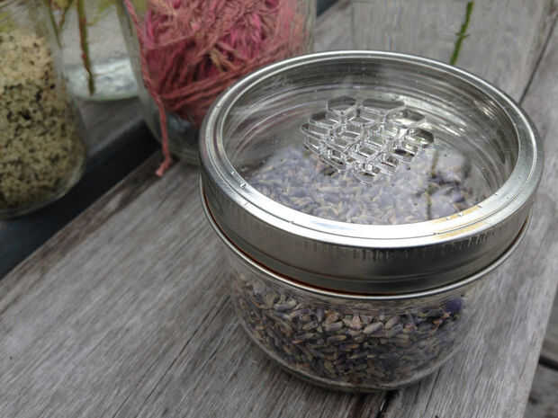 Esta tapa fue pensada para ser utilizado como una coctelera cáñamo semillas, gomasio o parmesano queso etc... También funciona muy bien como una tapa para popurrí, llena un pequeño recipiente de flores de lavanda para el baño (foto).