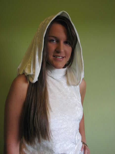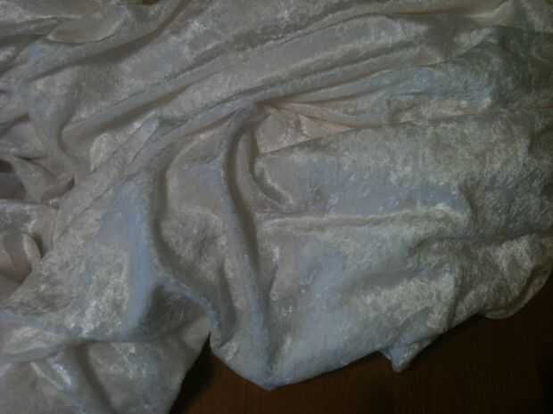 La tela que utilicé para mi era terciopelo panne picado en color blanco. Sí sé que esto no es exacto pero era la tela solamente tuve que funcionara. Sugerimos que pruebe un punto elástico blanco como el que usan para camisetas si usted puede encontrar (tuve algunos era va a usar pero enteré de alguna manera había conseguido manchado en almacenamiento... por lo tanto, la versión de terciopelo panne acabé haciendo).