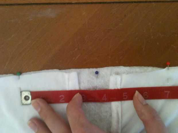 Decidir qué tan amplia debe ser el agujero del cuello. Para mi superior, mide alrededor de mi cuello (14 pulgadas) y que cortan a la mitad (7 pulgadas). Significa que necesita 3 1/2 pulgadas de espacio en cada lado del de pin marcado el centro. Con su cinta de medir, marcar donde comenzará y finalizará el agujero del cuello.