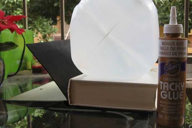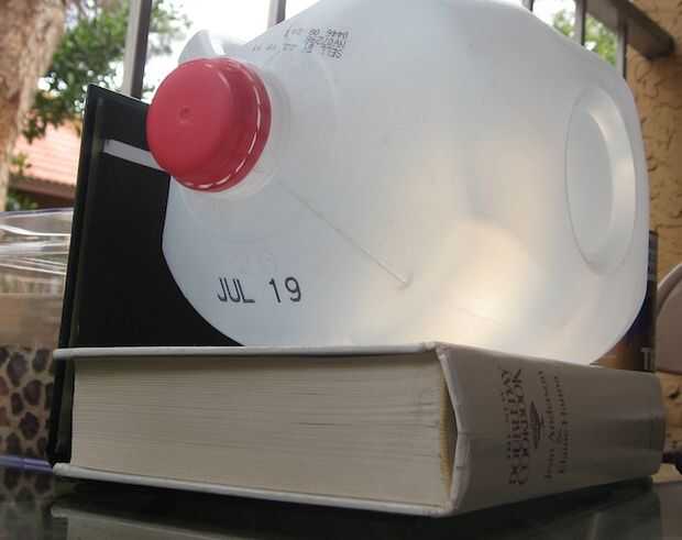 Paso 9: Utilice el pegamento adhesivo para fijar la espuma al interior de la cubierta. Pegué la tapa primero luego la tapa frontal. Dos de los cuadros muestran cada cubierta presionada por un libro y un galón de agua como el secado de la cola, con un objeto alto, plano, manteniendo el otro. No pegar la espuma a la columna vertebral. El libro original no estuviera pegado a la columna vertebral, así tampoco debe nuestra modificación de espuma.