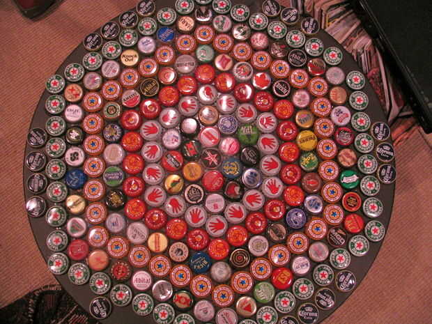 Empezamos con un diseño al azar, con sólo una cápsula de cada clase que tuvimos en nuestro escondite de tapa. Este sitio izquierdo para algunos se repite, así que organizamos un patrón alrededor de la forma circular de la tabla.