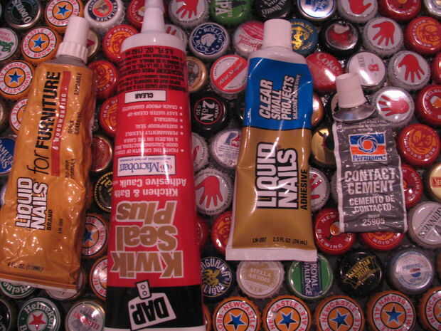 Ya que estábamos cubriendo la mesa con resina transparente, no estábamos demasiado preocupados con el tipo de pegamento usado. Comencé con cemento de contacto, se trasladó a pegamento de muebles, entonces Liquid Nails para pequeños proyectos e incluso trató de siliconado. terminé usando pegamento viejo llano. Esta fue la mejor opción y la que sugiere para usted. Puesto que las tapas van a conseguir cubiertas de resina, apenas necesita pegarse a la mesa, así que un par de puntos son todo lo que necesitas. No enloquecer, porque pegamento exceso sucio mostrarán a través de la resina cuando termines.