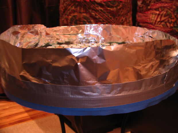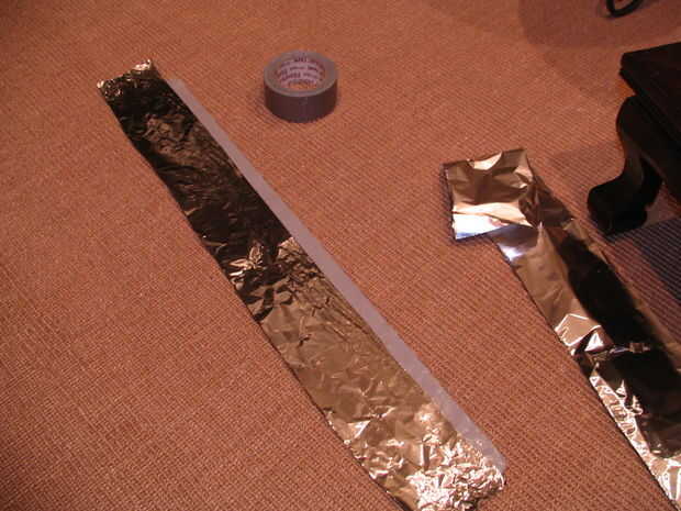 6a. decidí usar aluminio papel de aluminio y cinta adhesiva. En primer lugar, cortar unas tiras largas de cinta adhesiva para ir alrededor del borde de la mesa. A continuación, corte tiras de papel de aluminio de 3" de ancho y 1" más que tu tiras de cinta aislante. Poner las tiras de lado pegajoso de la cinta de conducto para arriba, cuidadosamente cubra aproximadamente la mitad de la cinta con una tira de papel de aluminio. Ver foto para detalles. El recto puede hacer esto mejor. También podría hacerlo con cinta de pintor ancha y eliminar la necesidad de cubrir los bordes de la tabla con cinta de pintor en el paso 5.