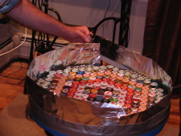 6B. pegue las tiras de cinta de aluminio alrededor del borde de la mesa, asegurándose de que el borde inferior de la hoja cae justo debajo de la superficie de la mesa (la mesa real, no los tapones de botellas). Ver foto para detalles. La razón: Si la superficie pegajosa de la cinta del conducto está por encima de la mesa, la resina se adhieren a ella y derrotar el propósito de hacer una barrera de fácil liberación. Si la hoja está demasiado por debajo de la mesa, puede escurrirse la resina sobre el borde, atrapando a cinta azul por debajo.
