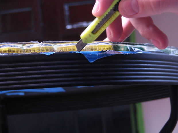 Después de que la resina está completamente establecida, cuidadosamente empiece a desprender a la cinta de aluminio. Si el aluminio se mantuvo relativamente suave y la cinta no estaba en contacto con la resina, debe pelar lejos la resina endurecida fácilmente. La única zona que tenía problemas era donde algunos resina filtró entre extremos traslapados de la cinta de aluminio. También, hubo un par de lugares donde la resina filtró sobre el borde de la cinta azul ligeramente. Estos fueron ambos fácilmente subsanable con un cuchillo de la manía.