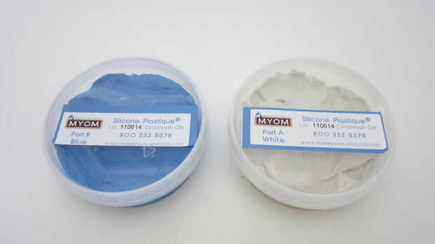 Masilla de silicona por lo general viene en dos partes (parte A y parte B). Cada uno por sí mismo es suave y tiene la consistencia de Play Doh. Pero cuando se combinan, rápidamente la cura y endurece.