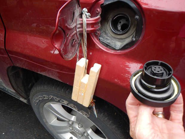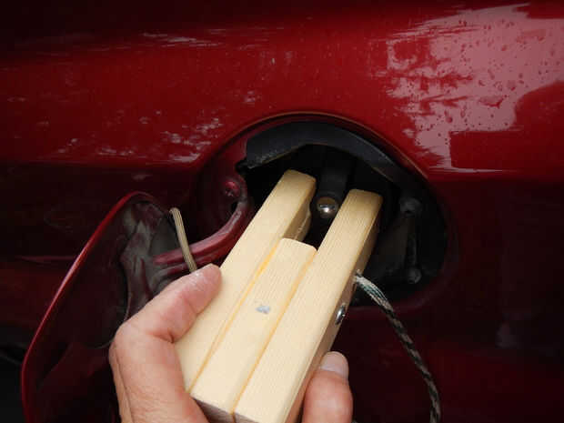 Fundir los extremos de unos 15-16" de cable de 550. Usar nuestro gas de la estufa; una vela también funciona bien. Introduzca un extremo de su cable a través de este nuevo agujero y haga un nudo fuerte en los extremos que puede lazo su casquillo ágil sobre la puerta de la tapa de gas abierto mientras usted está llenando su tanque. (Si desea hacer cualquier pintura o aplicaciones de un acabado de protección tales como Varethane, no antes de agregar el cable).