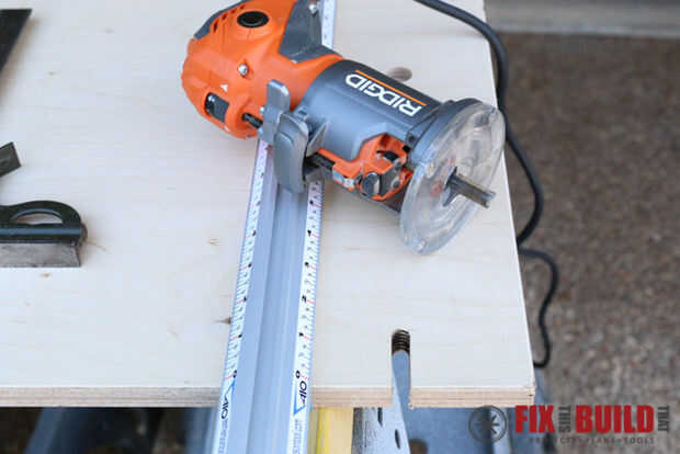 Corte 2 ranuras en cada lado de la tapa del tirón bloqueo de hardware. Las ranuras son 3/8 ancho, 1-1/2 pulgadas de largo y 2-5/8″down de la parte superior. Usé un router y un borde recto para hacer esto.