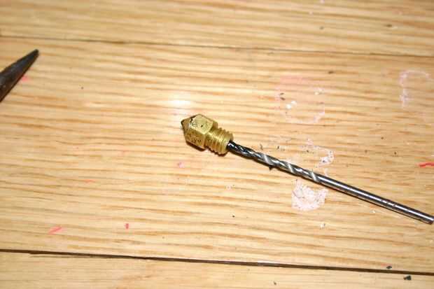 Una broca pequeña (o un palillo de dientes) y tire tanto plástico"sucias" como sea posible. No perforar dentro de la boquilla, sólo utilice presión con la mano para eliminar suavemente el plástico.