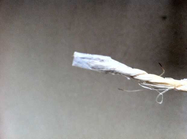 he utilizado un hilo medio grueso para la cuerda. Cortar un trozo que es de unos pies más largo que lo terminaras necesitando para hacer el proceso de colgar que después viene más fácil. Para facilitar pasar la cuerda por los agujeros que te metiese en las esquinas de cada registro (oh sí, no puede utilizar los valiosos...), la cinta al final de la cadena tan ajustadamente como sea posible.