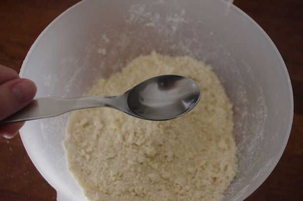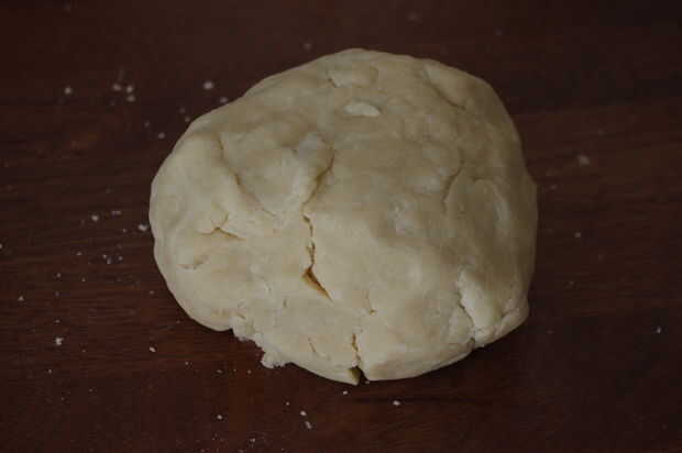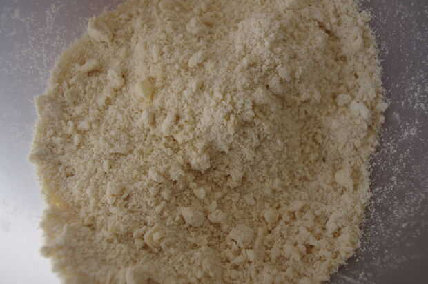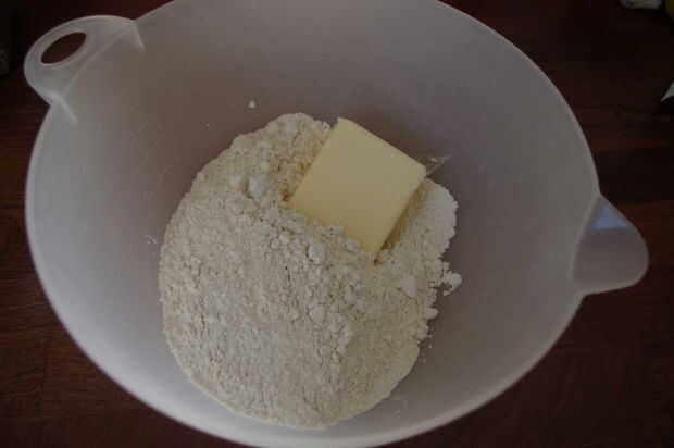 Primer paso es hacer una masa de pastelería sin azúcar. Comenzar mezclando la mantequilla fría y la harina en un bol. Masaje de la mantequilla y la harina junto, hasta que no queden grumos grandes a la izquierda. Añadir el agua (terminé añadiendo un poco más de agua, pero su masa podría diferir de la mía, así que probar con 3 cucharadas de agua al principio).