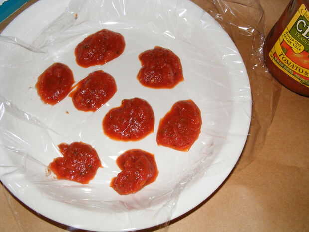 Poner toques de tamaño cucharada de salsa de tomate en la envoltura de plástico.