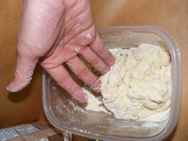 Enharinar las manos y cavar para empezar a mezclar todo en una masa.