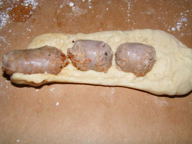 Coloque algunos trozos de carne o salchicha enlaces a lo largo de una capa de masa.