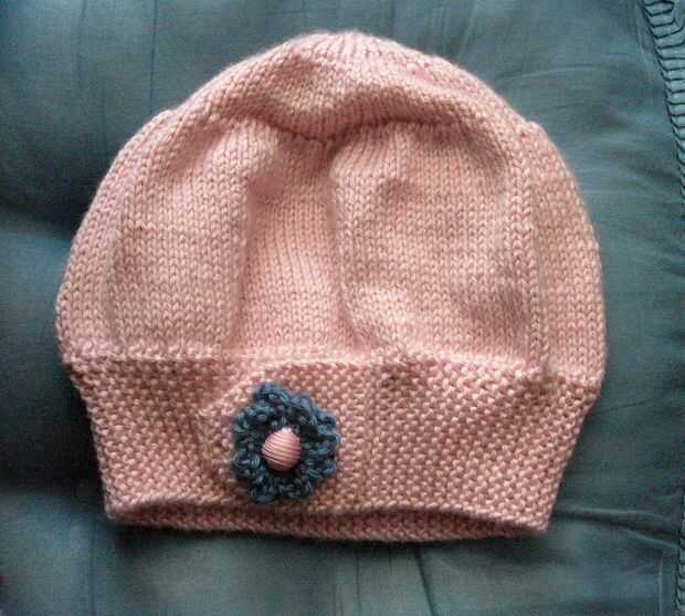 Luz sombrero rosa con flor en el borde del punto de arriba hacia abajo usando el hilado Caron simplemente suave en rosa suave y un patrón que se encuentra aquí y llamado "Pi Topper Chemo Cap"