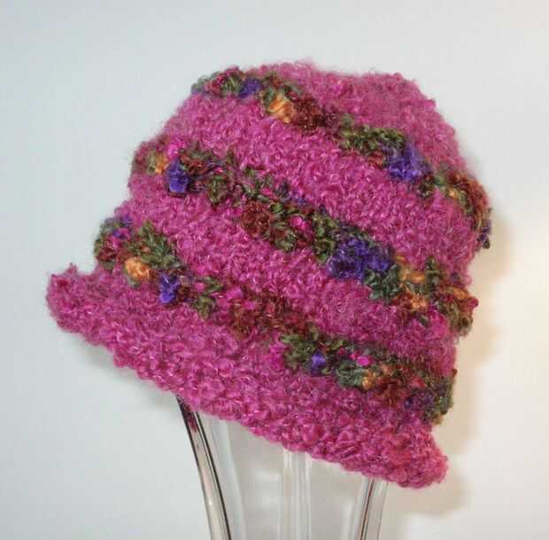 Borde laminado en color de rosa con sombrero de raya se teje utilizando un laminado en sombrero, tejer en redondo con León Boucle rosa y rayas con una puntada de bobble en Tutti Fuitti.