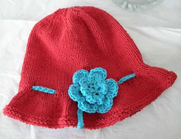 Sombrero de ala ancha rojo con flor turquesa. De punto 100% algodón con un patrón como un archivo compartido en este grupo de yahoo