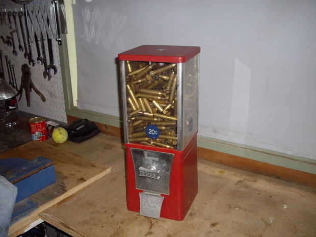 Echa un vistazo. Adivina cuántos cartuchos gastados están en mi máquina de goma de mascar. Más guess consigue un parche. Si la clavo se Obtén dos parches. Una conjetura por cliente.