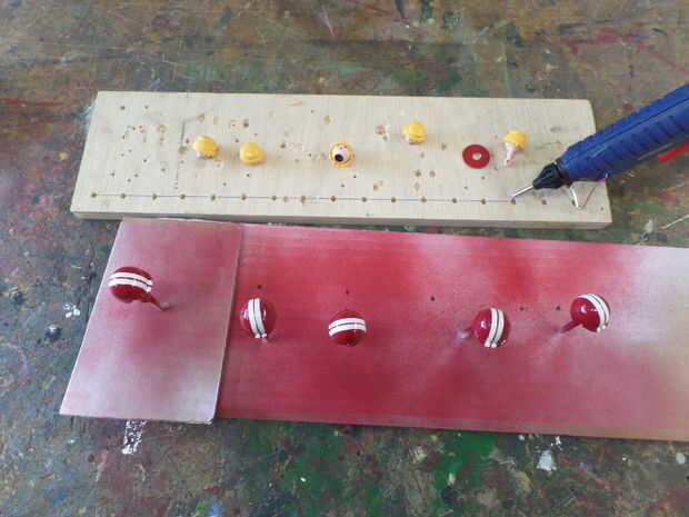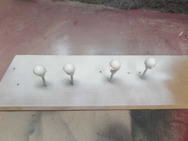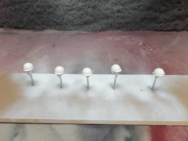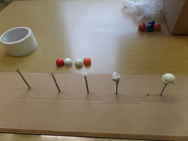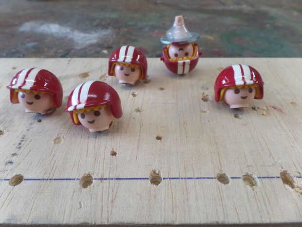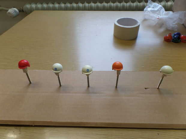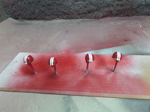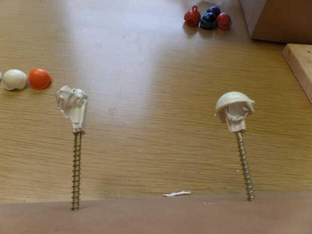 Para arreglar los cascos para la figura, tomé algunos tornillos, pegada en un pedazo de cartón corrugado y envuelto de alguna cinta alrededor de la crewheads (lado pegajoso hacia afuera). Esto hizo que un simple estante para pintar los cascos.