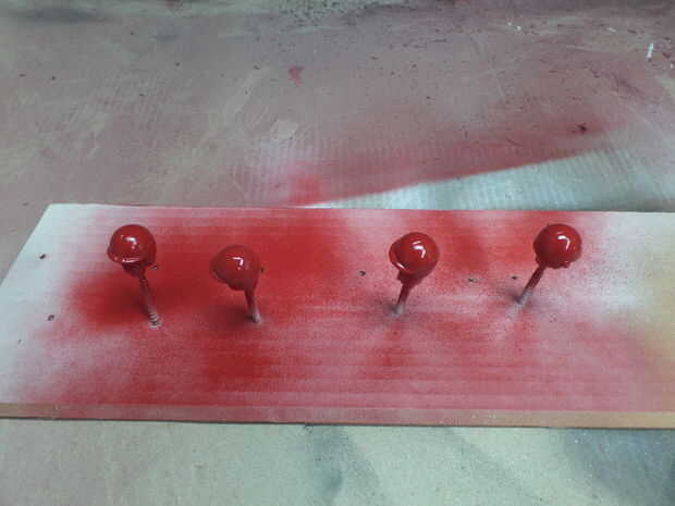 Después de aproximadamente media hora, había terminado para arriba con el rojo, llevó la cinta de enmascarar (media hora) y le dio unas pocas capas de capa clara brillante.