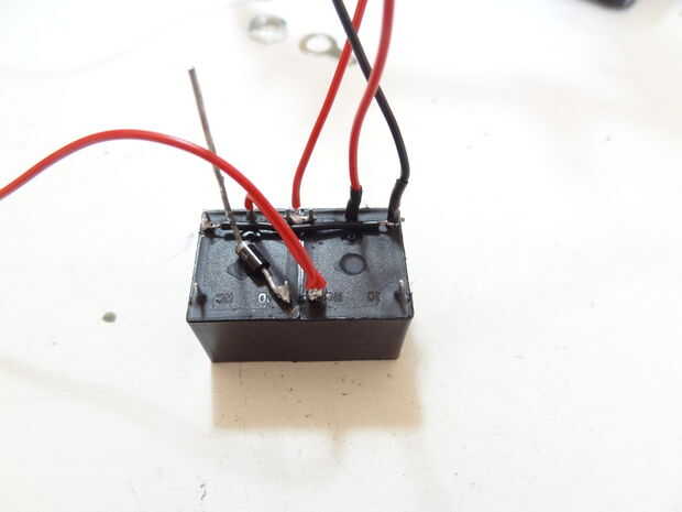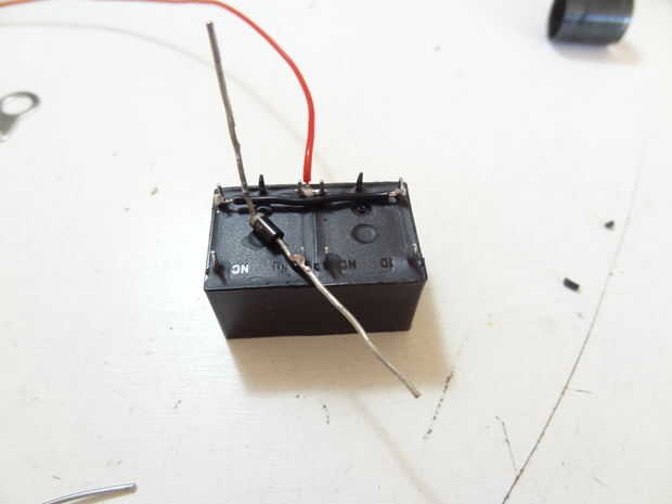 -Lugar un diodo en el normalmentecerrado pin de uno de los dos relés, escogí la izquierda una. El diodo debe tener la línea hacia el pin.