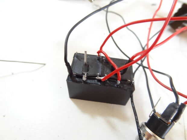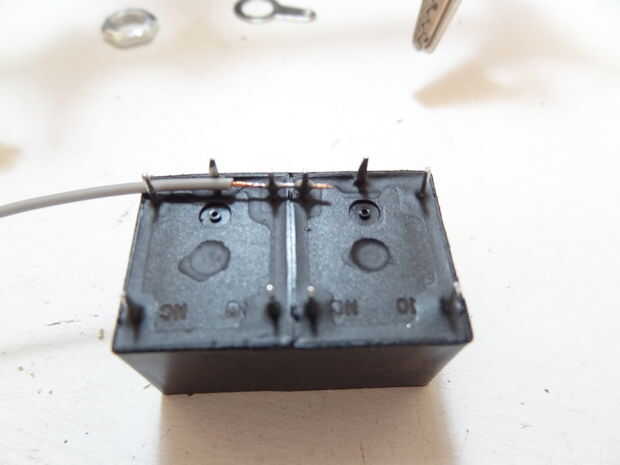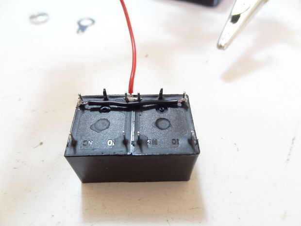 -Ahora que están juntos, coloque un cable conectando las 2 clavijas más cercanas uno al otro. Pertenecen a las bobinas de los relés.