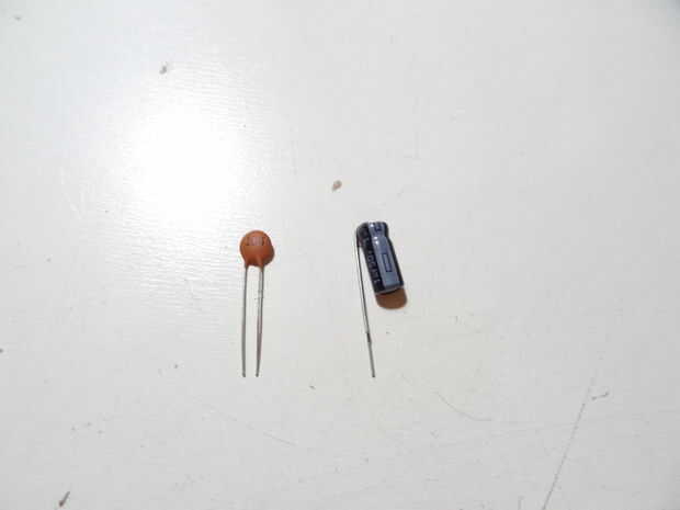 Entre los pines 1 y 2 va la uF 0,1 uno y el otro entre los polos 2 y 3.