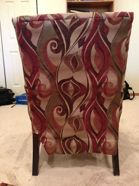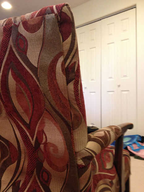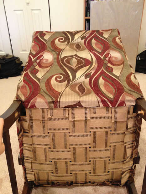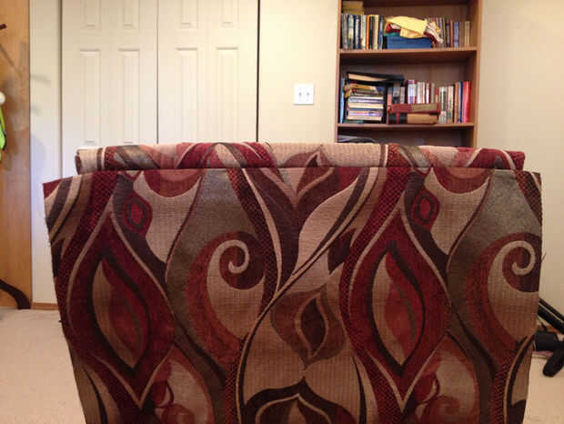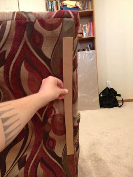 Primero, tome su pedazo de tela (lo suficientemente grande para cubrir la espalda entera, con dos pulgadas de margen en todos los bordes) y colóquela boca abajo sobre el respaldo de la silla. Para éste, puede simplemente colocar el cartón y uñas bien de fácil peasy. Sólo asegúrese de que el borde es recto, el borde del cartón y el borde de la tela, por lo que la tela no tire hacia un lado más abajo.