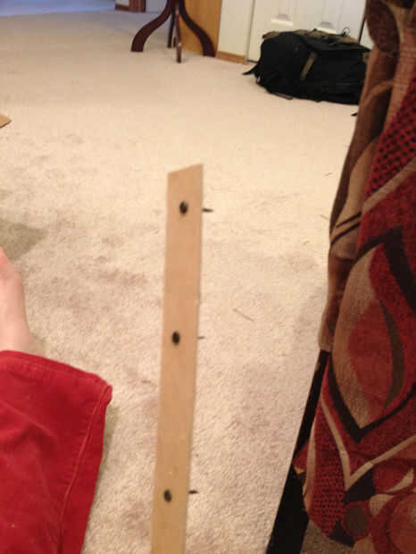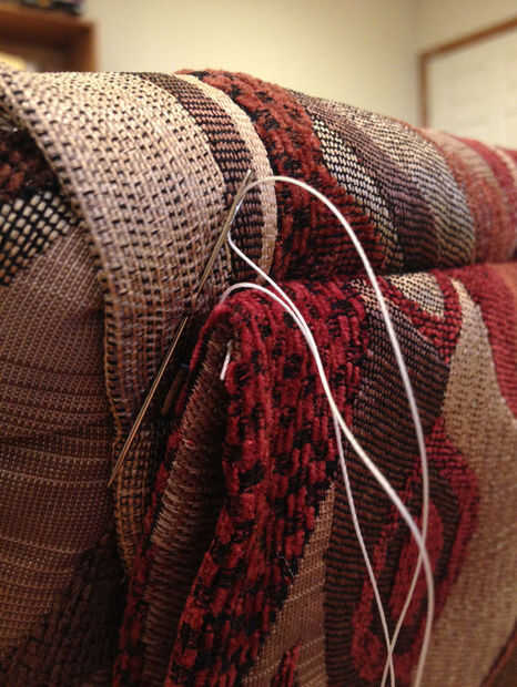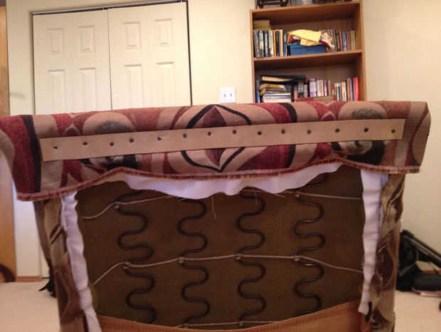 Hay un producto que es de tiras de cartulina con clavos previamente insertados; sin embargo, ya había un montón de clavos y siempre es fácil encontrar cartón de desecho por lo que acaba de hacer algunos. Las tiras Sujete la cubierta de tejido apretado a la espalda clavando en y dan un agradable limpio borde doblado de la cartulina. Utilizar una cartulina pesada en lugar de corrugado, que es demasiado grueso. Detrás de un cojín de papel son un buen grosor (y si no puede encontrar cualquier cartulina más grande que una plataforma legal, sólo se superponen dos corta tiras de una pulgada y una o dos uñas).