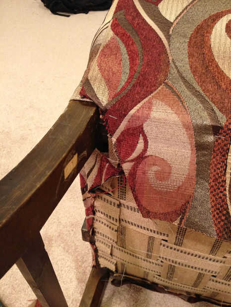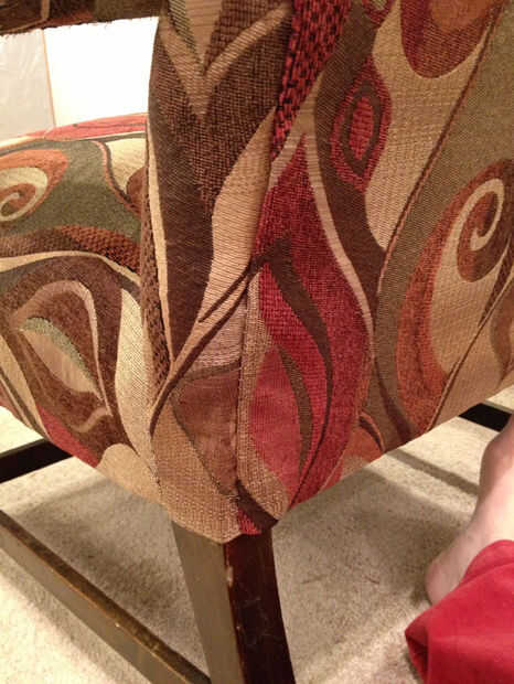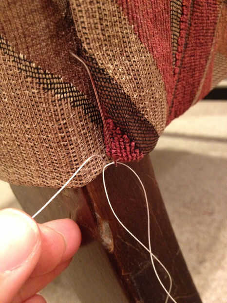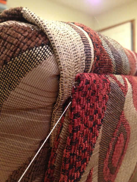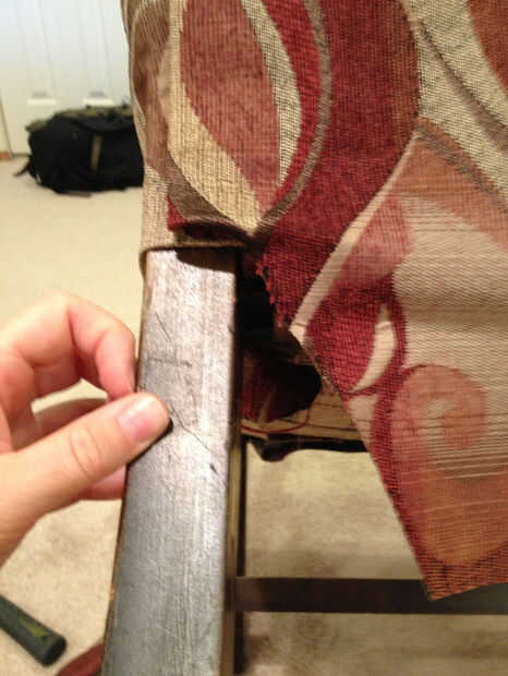 Para los lados, crear tiras tu previamente clavados a unos 3/4 la longitud de la espalda. Encontrar donde el doblez del borde bonito debe ser y meter la tira dentro de la tela con el borde que dobla y los clavos atravesando el borde doblado hacia el marco de la silla. Hacer ambos lados, asegurándose de que está incluso y no caídas en el medio y a través de la tela del martillo los clavos. Tener cuidado con esto como martilleo excesivo puede dañar las fibras encima de la cabeza del clavo.