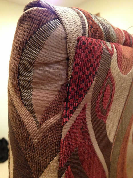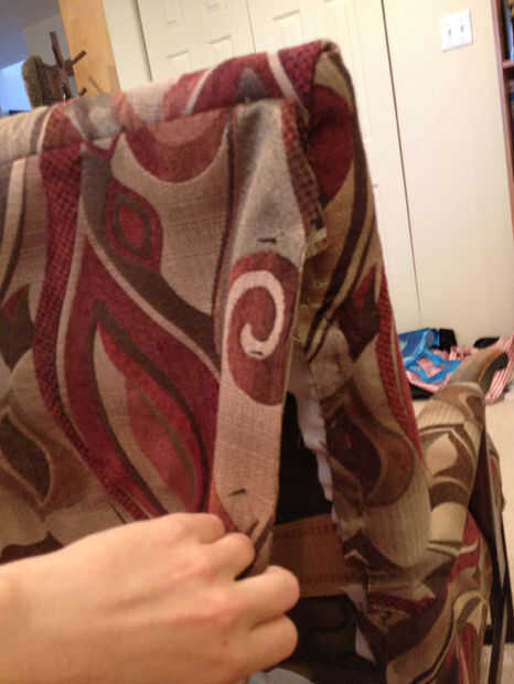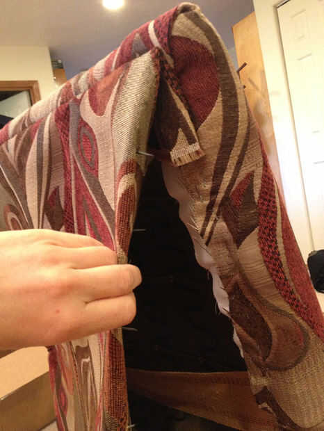 Coser los bordes juntos desde el exterior, como con el borde de cojín de asiento trasero lateral. Esto toma un poco de tiempo pero proporcionar el mejor acabado y que pueda meter en cualquier callejeros fibras. Acuerdo con el fondo antes bastante terminar la costura - y de hecho puede no tener que coser todo el camino, depende de cómo salió el cartón. Para la parte inferior, usted no necesita una tira de cartón, solo que debajo de grapa con el resto de los bordes inferiores. Usted probablemente tendrá que hacer un recorte en el interior de la pierna de borde para permitir que el tejido sobre la pierna a ser doblado para arriba, mientras que el resto se dobla bajo. Vea el pic para esto. Una vez hecho eso, coser las esquinas inferiores, y que es la parte de atrás hecho.
