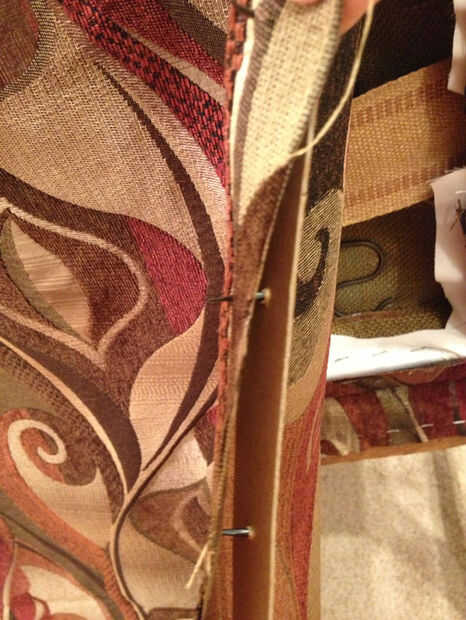 La tela de forro es sostenida en lugar por clavos y cartón - cartón produce un bonito borde recto cuando la tela se dobla sobre. No es fácil que le mantenga apretado en los lados, sin embargo, porque la tira debe ser instalado desde el interior... esta será más clara en un poco. Pero los lados, también cosí abajo, porque veía mejor.