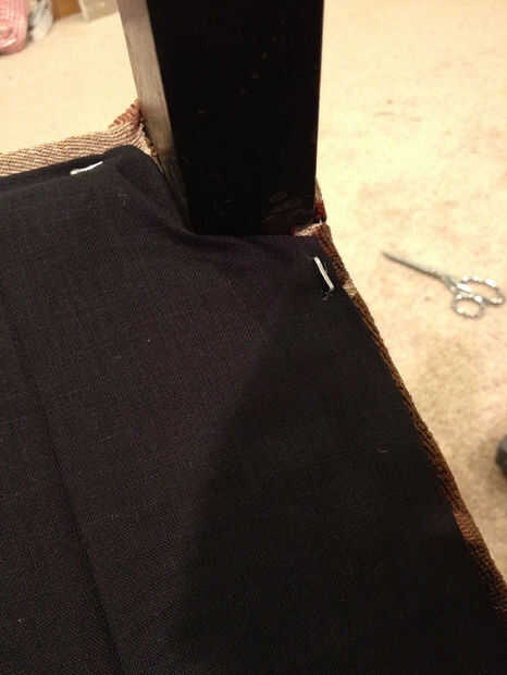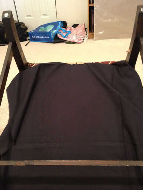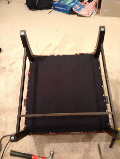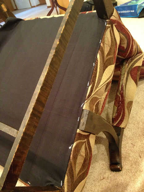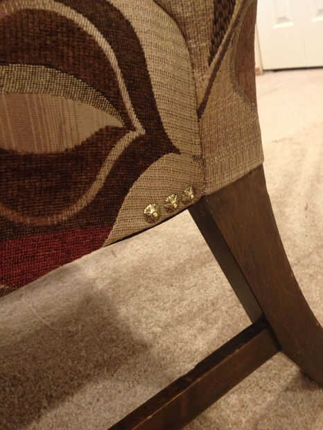 También este sillón fue diseñado para uñas decorativas, y habíamos conseguido algunas otras bastante nuevas. Estas clavado en es una simple cuestión de un martillo. Asegúrese de los espacio, especialmente en áreas como las esquinas delanteras de lado, entre el brazo vertical y la esquina de la Plaza, como no quieras antiestéticos agujeros en el patrón. Si, como el mío, su silla tenía clavos decorativos en él, puedes encontrarte clavado en los orificios existentes. Si tus uñas nuevas no son ligeramente más largas que las antiguas, utilizar algún pegamento para madera en cada agujero que está suelto. Hay muy poca presión en los clavos para que pegamento será suficiente para mantenerlos en su lugar.