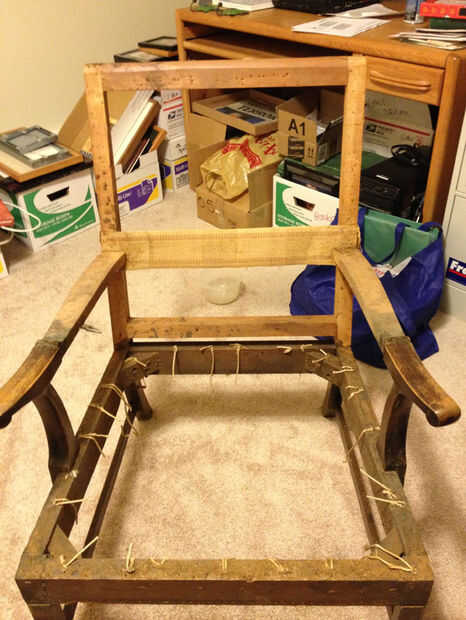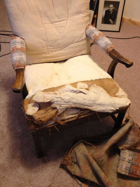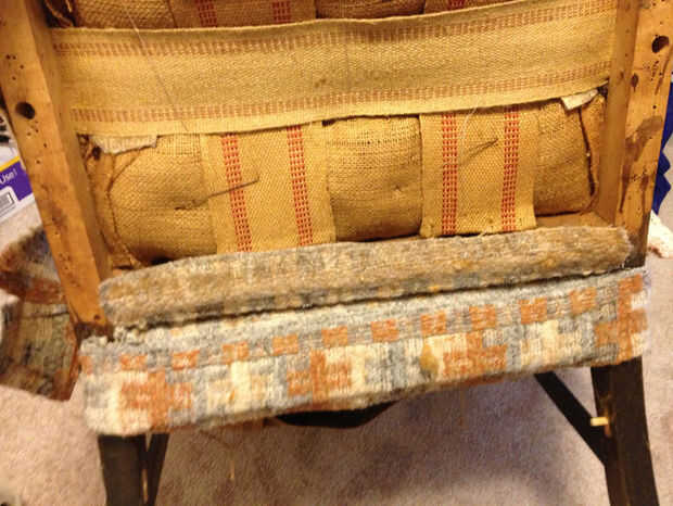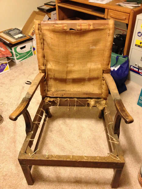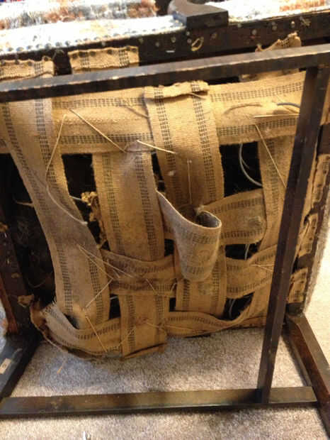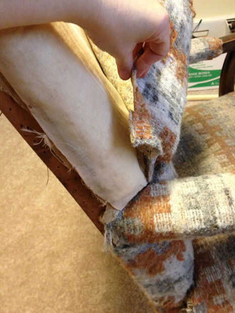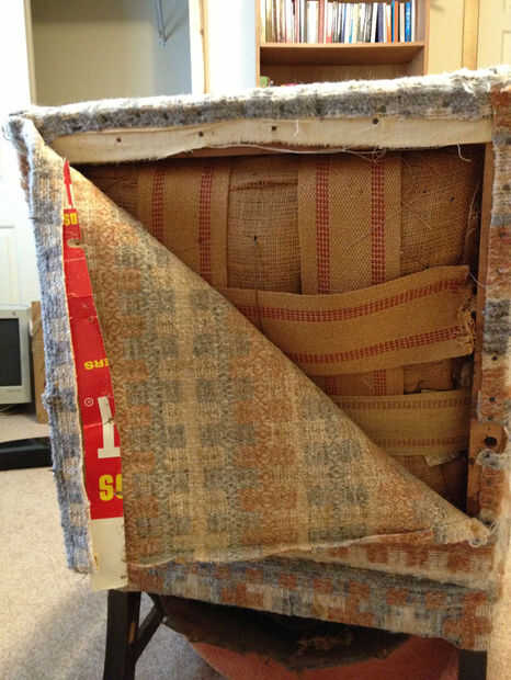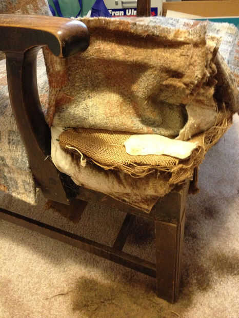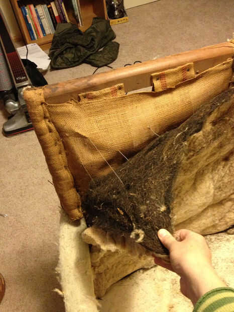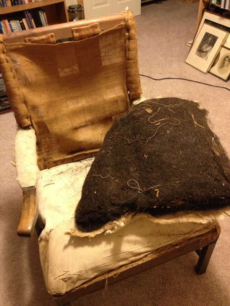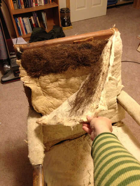 He guardado todas las piezas de la tela exterior en caso de que necesitaba un patrón para el nuevo tejido, pero esta silla era todos los rectángulos y no usarlo. Salvo los clavos decorativos así (los que no había caído estaban en perfecto estado), pero otra vez no usarlos como habíamos elegido los nuevos. La crin, guata de algodón, tela de forro de algodón, arpillera y correas del yute lancé hacia fuera inmediatamente. Y entonces tuve que vaccuum. Esta parte tuvo alrededor de 4 horas tomó un montón de fotos y estudiar la construcción. El último paso fue a sacar todos los clavos y grapas e Inspeccione el marco de los daños. Tuve la suerte que el marco estaba bien excepto por una ayuda de pierna que falta en la parte trasera, que había sido falta años de todos modos y decidió no molestar reemplazar.