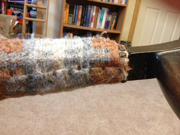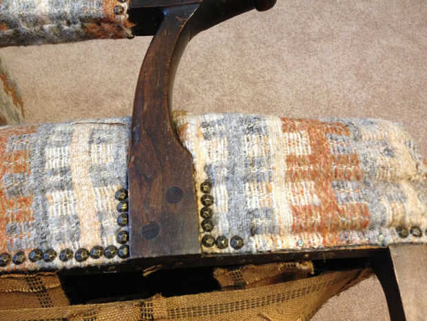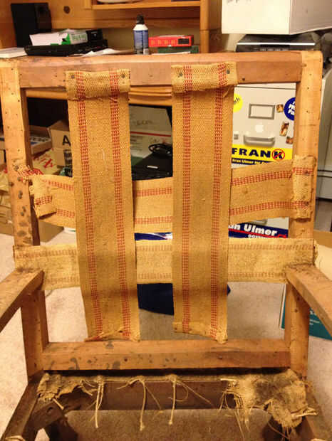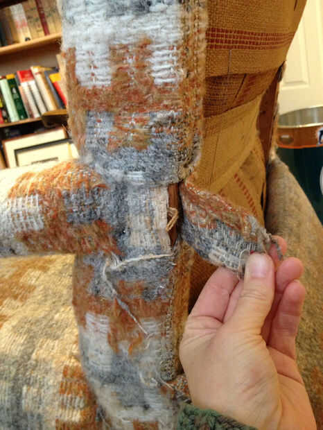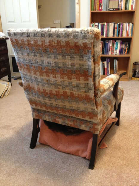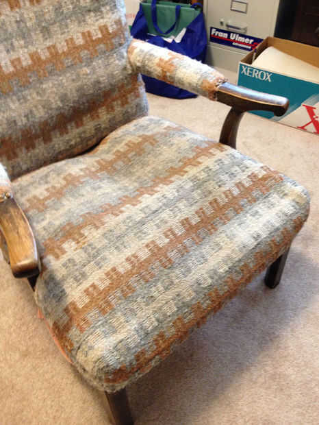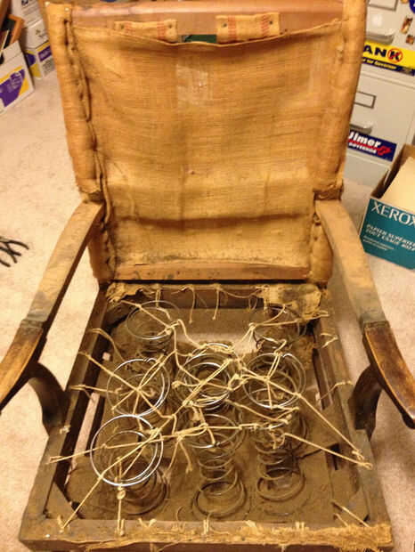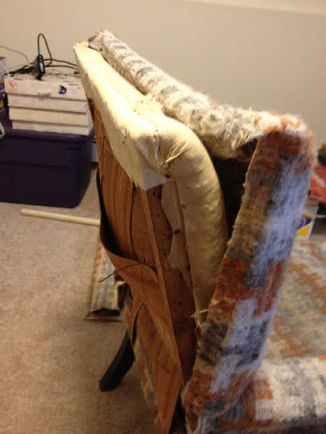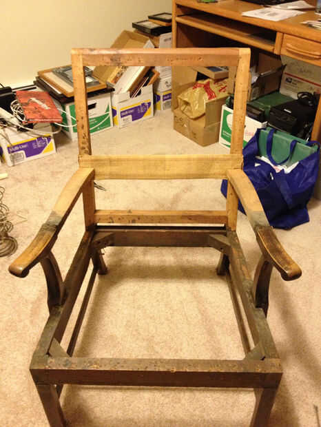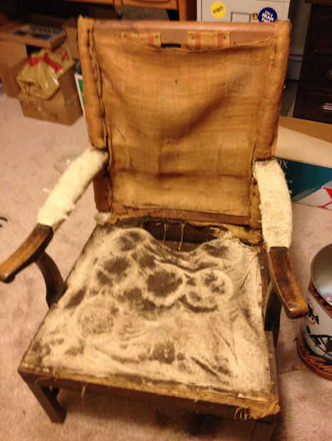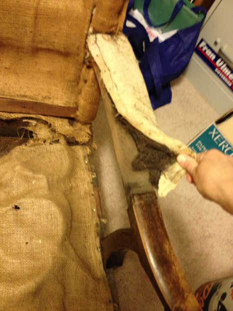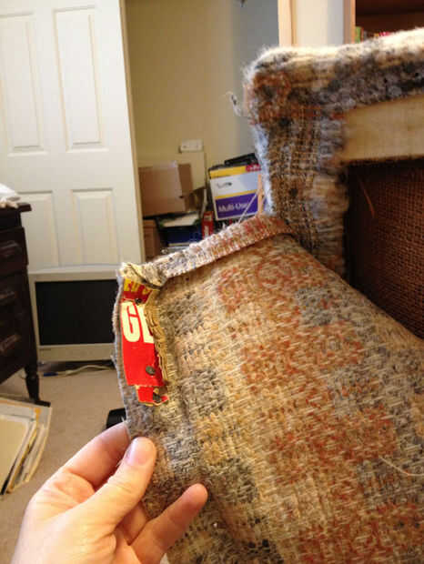 He guardado todas las piezas de la tela exterior en caso de que necesitaba un patrón para el nuevo tejido, pero esta silla era todos los rectángulos y no usarlo. Salvo los clavos decorativos así (los que no había caído estaban en perfecto estado), pero otra vez no usarlos como habíamos elegido los nuevos. La crin, guata de algodón, tela de forro de algodón, arpillera y correas del yute lancé hacia fuera inmediatamente. Y entonces tuve que vaccuum. Esta parte tuvo alrededor de 4 horas tomó un montón de fotos y estudiar la construcción. El último paso fue a sacar todos los clavos y grapas e Inspeccione el marco de los daños. Tuve la suerte que el marco estaba bien excepto por una ayuda de pierna que falta en la parte trasera, que había sido falta años de todos modos y decidió no molestar reemplazar.